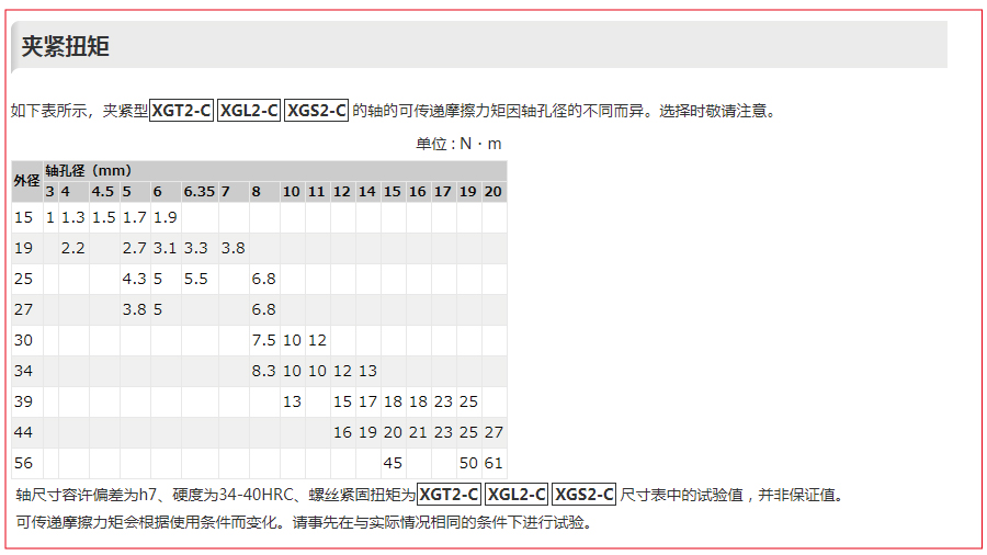 使用夹紧型时,即使低于额定扭矩,旋转轴也会发生滑移,从而出现无法传递扭矩的情况,因此请一并确认可传递摩擦力矩。