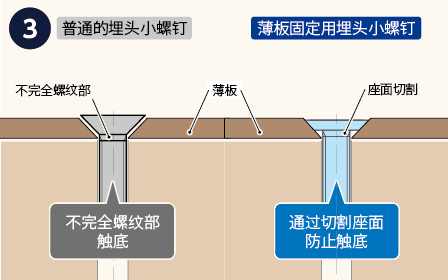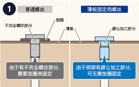 座面经切削加工的埋头小螺钉。防止在固定薄板时因座面或不完全螺纹部造成的触底问题。