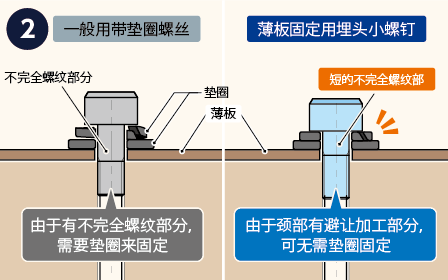与普通带垫圈螺丝相比,包含不完全螺纹部的圆柱部更短,可紧固的板厚不到一半。