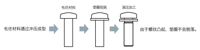 由于采用了这样的制造工艺,螺纹的外径比垫圈的内径更大,因此垫圈不会从螺丝上脱落。